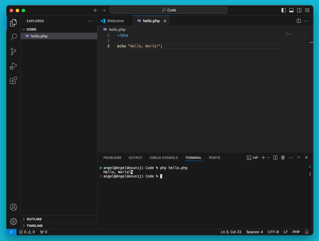php hello.php你应该在终端中看到输出 “Hello, World!”。